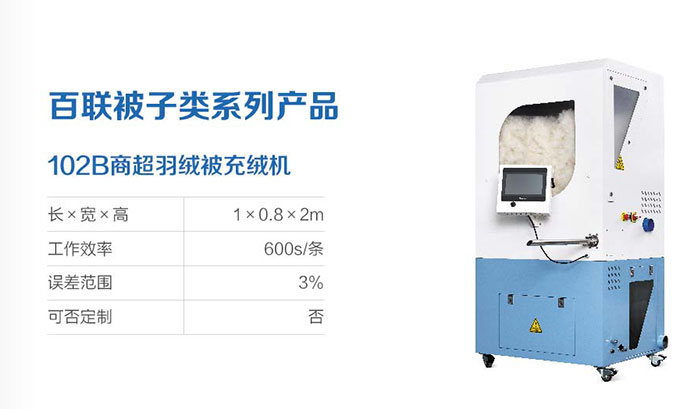百聯展品:102B小型充絨機、402D絨棉一體機、2401X模塊化充絨機