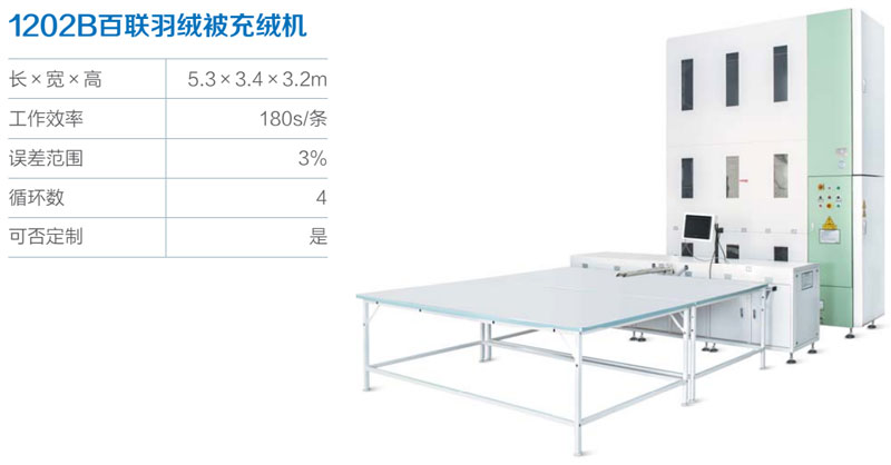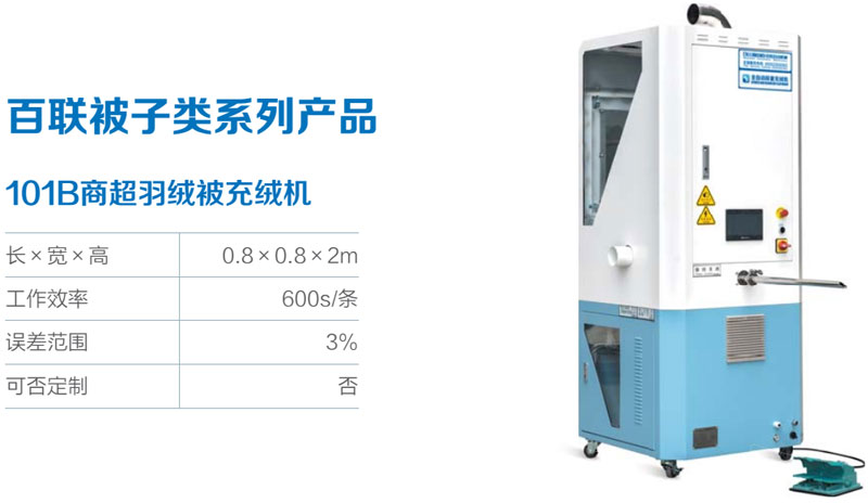 除了上述解決方案之外,百聯(lián)還自主研發(fā)了滿足DIY羽絨被需求的101B型自動充絨機,適用于商店或超市等場所,通常只需10分鐘,就能經(jīng)過上絨、充絨等自動操作完成1條羽絨被的制作。