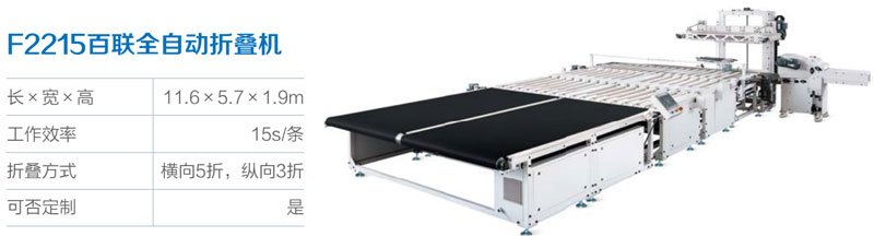 F2215型被子折疊機是新升級后的羽絨被自動化生產(chǎn)輔助設(shè)備,它采用流水線作業(yè),通常能在10~15秒完成一床羽絨被的折疊和包裝。它的折疊方式為橫向5折、縱向3折,能對折疊好的羽絨被進行擠壓、包裝。