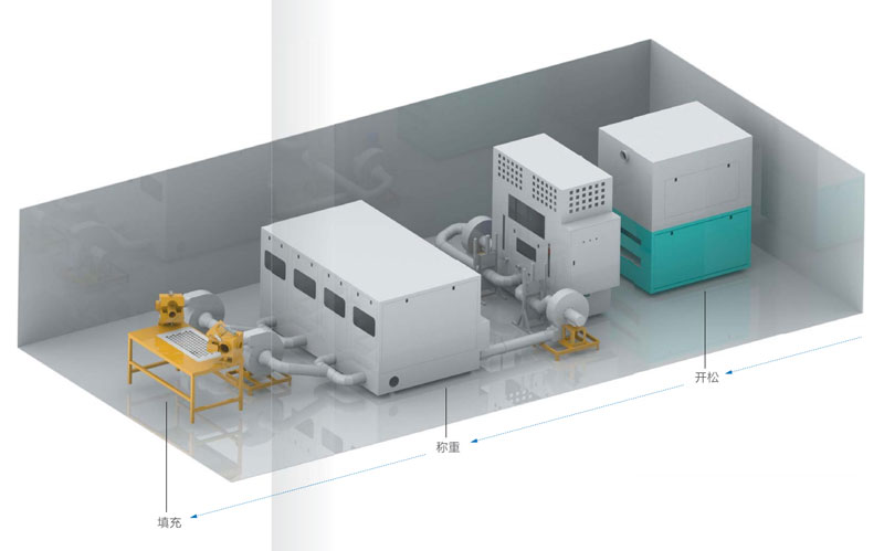 再看,針對枕芯的自動化解決方案(如下圖所示)。 它主要由開松、稱重、填充三個流水線環(huán)節(jié)組成,主要涉及產(chǎn)品有:百聯(lián)自主研發(fā)的自動開松機以及枕芯填充專用設(shè)備。