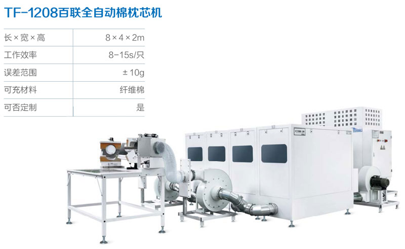 1208型全自動棉枕芯機為全新產(chǎn)品,可填充纖維棉,能在8~15秒之內(nèi)完成1只棉枕芯的填充。