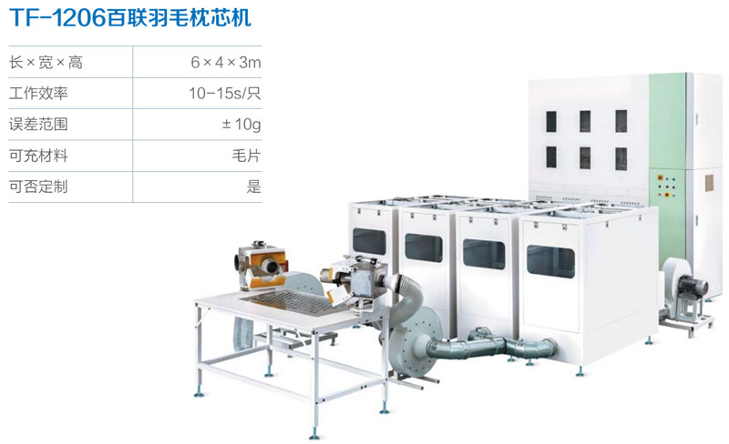 1206型羽絨枕芯機,設(shè)計了2個充絨口,采用2稱重循環(huán)稱重,充絨精度為0.1g,可填充羽絨毛片,能在10~15秒之內(nèi)完成1只枕芯的填充。