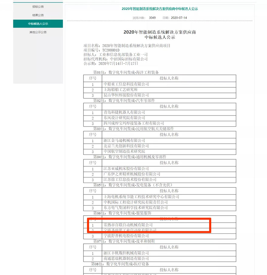 近日,國家工業(yè)和信息化裝備工業(yè)一司委托招標(biāo)代理機(jī)構(gòu)中招國際招標(biāo)有限公司公示了“2020年智能制造系統(tǒng)解決方案供應(yīng)商”中標(biāo)候選人名單。我司(常熟市百聯(lián)自動機(jī)械有限公司)經(jīng)過與多方競爭及嚴(yán)格篩選成為中標(biāo)候選人,成功中標(biāo)“數(shù)字化車間集成-服裝服飾”項目。